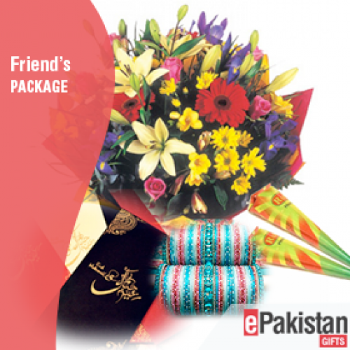 2 Mehndi cone and attractive Choori set in contrast shades Appx. 2.5 dozen with a colorful flower bouquet. Celebrate all the happy moments in life with loved ones even if they are far away from you. The gift package includes Mehendi and Chooriyan, with an elegant flower bouquet along with an Eid greeting card that will touch everyone's heart.