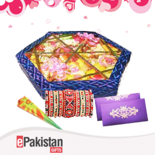 Mithai is a yummy sweet loved by everyone – children and adults. Can’t choose what mithai your loved ones will like? Why not send a box of tasty mixed mithai and surprise your family with this treat? It features Gulaab Jaman, Cham Cham, Laddu, Barfi, Qalaqand and many more and not only this, surprise your loved ones with this amazing mehndi cone, colorful bangles and a wedding card.